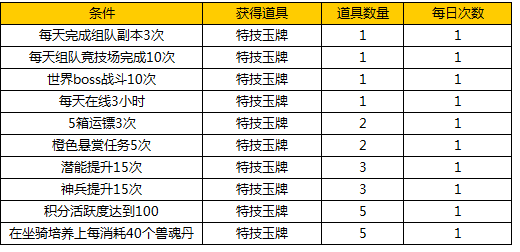 活动内容:群雄特技,烽火战连天!活动期间,每天完成相应的活动内容即可获得对应数量的特技玉牌。特技玉牌可兑换高级技能书!