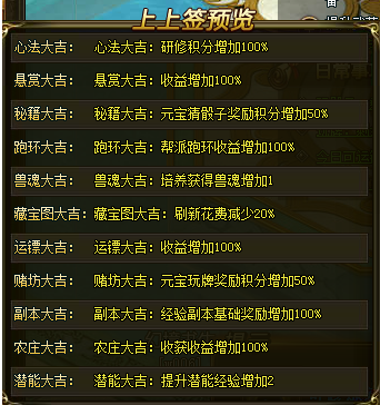 活动内容:活动期间开启吉日活动开启buff加成,参与buff加成的系统有:运镖,悬赏,副本,农庄,跑环,兽魂,潜能,藏宝图,心法,赌坊,秘籍等系统,不同签文buff加成不同,玩家可通过改签获得高buff加成的签文。