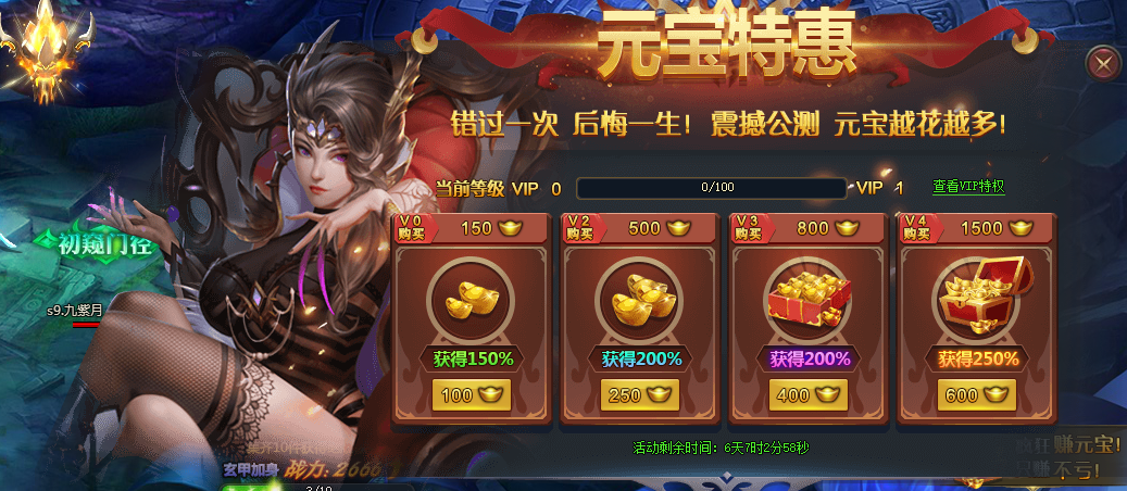 规则:达到指定VIP等级可领取多倍非绑定元宝,机会只此一次