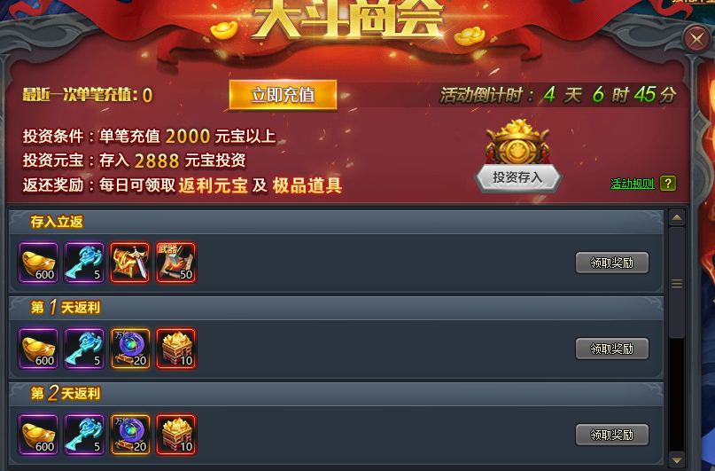 活动规则:玩家每天可免费领取一次超值礼包,若想继续获得则可通过元宝购买超值礼包。