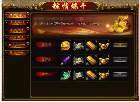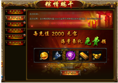 【活动说明】每充值2000元宝即可领取相应的充值奖励,每天最多可领取20次!