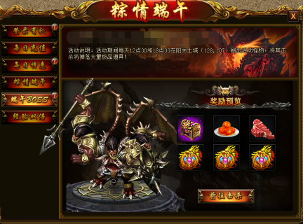 【活动说明】每天12点30分和18点30分在阳关土城(128,107)刷出活动怪物,将其击杀将掉落大量极品道具!