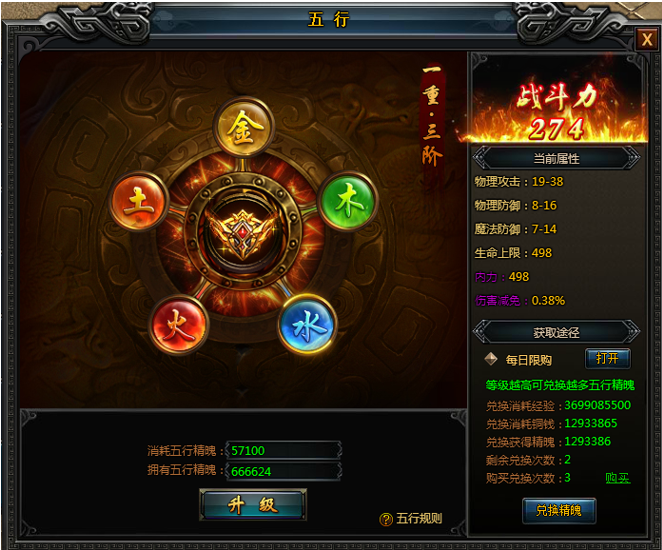 (金→攻击、木→魔防、水→生命上限、火→内力、土→物防)