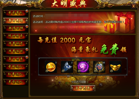 【活动说明】每充值2000元宝即可领取相应的充值奖励,每天最多可领取20次!