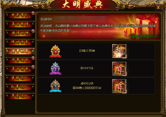 【活动说明】活动期间累计消费达到要求即可参与消费排名,活动结束后前三名玩家将获得珍稀道具!