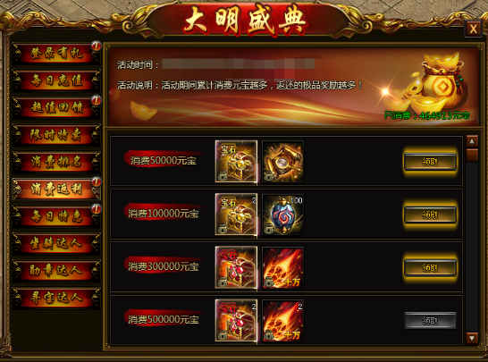【活动说明】活动期间消费达到一定档次,返还相应道具奖励,消费越多,奖励越多!