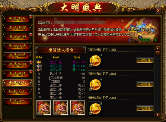【活动说明】活动期间消耗一定数量坐骑进阶丹即可领取相应奖励,达到入榜条件的前3名玩家,活动结束后活动额外奖励!