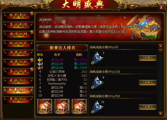 【活动说明】活动期间消耗一定数量成就令牌,即可领取相应奖励,达到入榜条件的前3名玩家,活动结束后活动额外奖励!