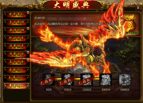 【活动说明】活动期间寻宝达到一定次数,可领取相应的豪礼!其中最后的宝箱奖励包含幻化坐骑皮肤“圣炎狮鹫”