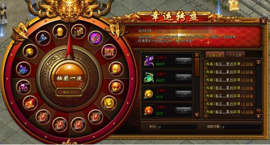 【活动说明】活动期间每消费1000元宝获得一次抽奖机会,消费越多,获得次数越多。每抽奖一次获得1积分,积分累计可以兑换珍贵道具(限兑换次数)。转盘有各种贵重道具(热血神装、稀有称号、坐骑皮肤、神兵碎片等等)