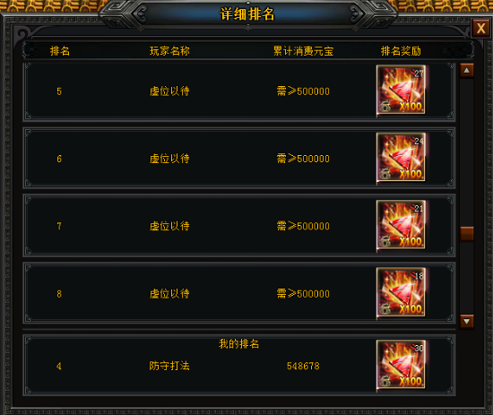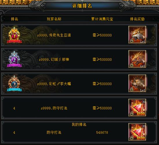 2、活动期间累计消费500000元宝可领取一份全服排名礼包(礼包内容:传说战魂礼盒1个、超级功勋令牌1个、超级五行圣晶1个)