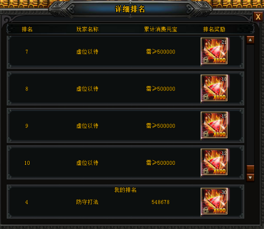 1、活动期间累计消费500000元宝即可参与排名,活动结束前3名玩家获得史诗战魂,4~10名玩家获得战魂碎片奖励!