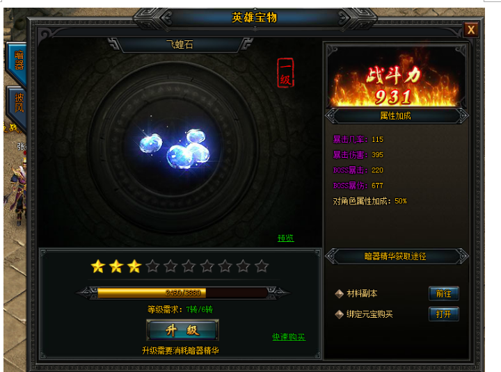 3、英雄宝物升级跟角色一样,材料共用,玩家可以选择升级英雄宝物或者角色宝物