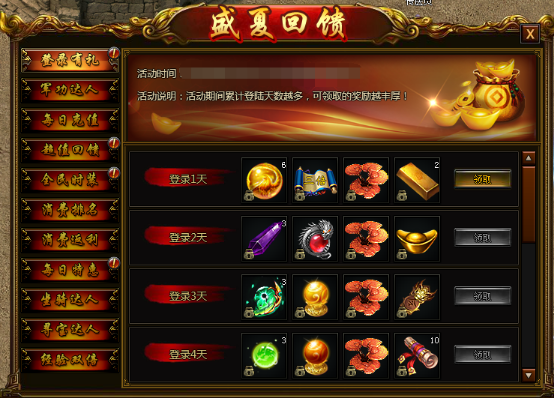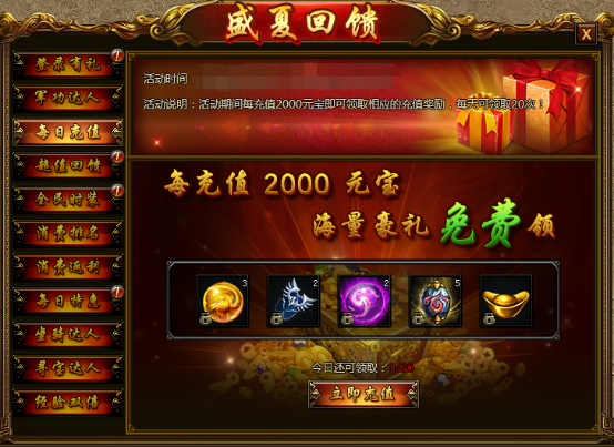 【活动说明】活动期间每充值2000元宝可领取一次奖励,每天最多可领取20次!