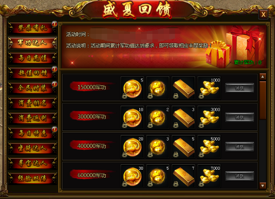 【活动说明】活动期间累计军功值达到要求,即可领取丰厚奖励!