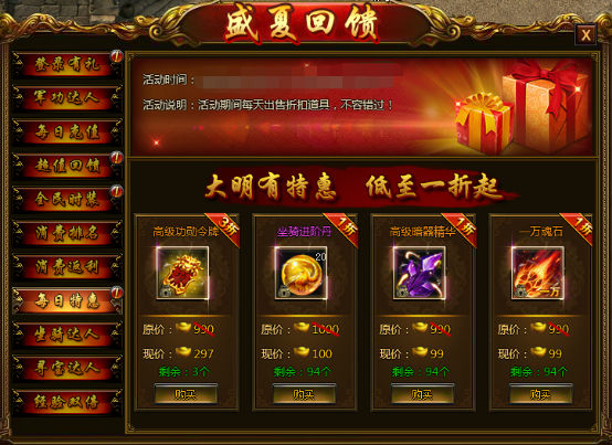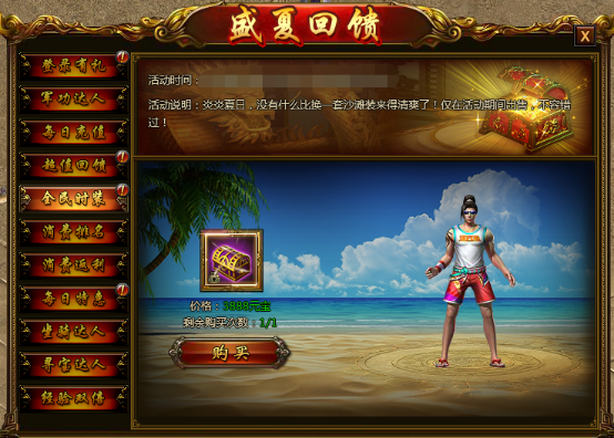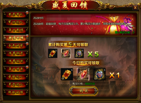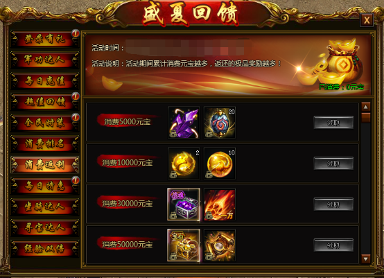 【活动说明】活动期间累计消费元宝越多,返还的极品奖励越多!