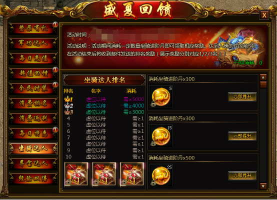 【活动说明】活动期间消耗一定数量坐骑进阶丹即可领取相应奖励,达到入榜条件的前3名活动结束会获得相应宝石礼盒!