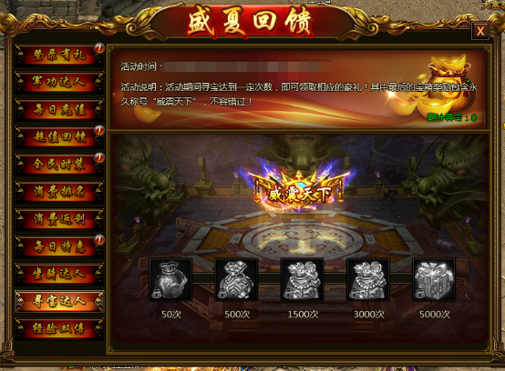 【活动说明】活动期间寻宝达到一定次数,可领取相应的豪礼!其中最后的宝箱奖励包含永久称号“威震天下”!