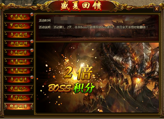 【活动说明】活动第1、2天,击杀boss可获得双倍boss积分,并且全天杀怪经验翻倍!