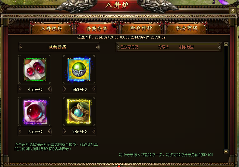 4、 发放丹药后,可立即获得对应的丹药,例如玩家分享10个回魂丹后,自己可立即获得10个回魂丹。