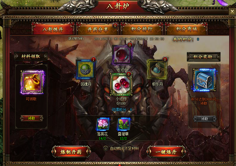 4、每次炼丹后会获得相应的积分,积分可以在积分商城兑换游戏道具。