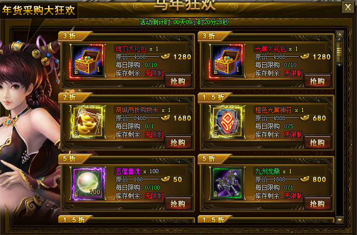 千机宝箱*2、9级五行钻石*1、骑兵陨铁*180(时限1天)、仙缘果*180(时限1天)、、商城两折购物卡(时限1天)、地煞神将精华箱子*2 |