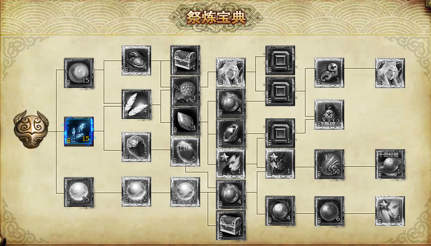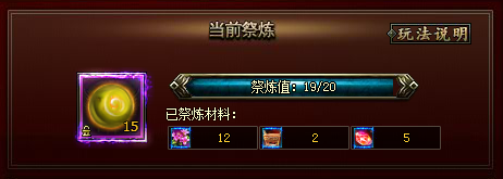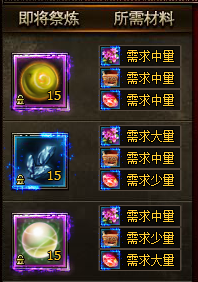 2. 玩家可针对不同的祭炼目标进行祭炼,不同的祭炼目标,需要的祭炼材料数量各不相同