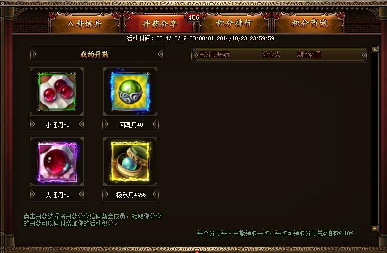 4、 发放丹药后,可立即获得对应的丹药,例如玩家分享10个回魂丹后,自己可立即获得10个回魂丹。