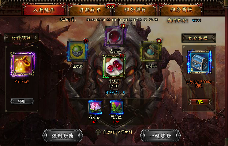 4、每次炼丹后会获得相应的积分,积分可以在积分商城兑换游戏道具。