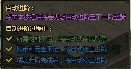 “自动进阶”则是懒的去点击鼠标,并且在材料、铜币、元宝足够的条件下,能够长时间地自动地进行坐骑的进阶操作,直到关闭坐骑进阶界面、进阶到下一阶坐骑或材料缺少时才会停下,中途以每3秒一次进行进阶操作。