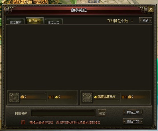 点击具体的物品后,会弹出物品上架框子,可以选择售卖铜币或元宝,也可以2者同时出售。输入价格之后,点击上架按钮,物品就可以正常售卖了,其他玩家也能在摊位搜索界面看到。