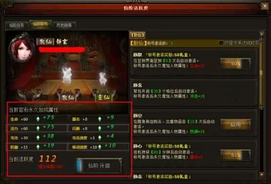 累计的活跃度可升级每个玩家的仙阶官衔称号,提升个人永久属性