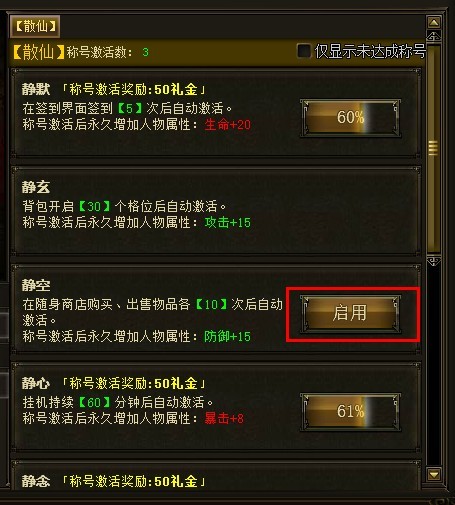同的仙阶包含各自不同的称号,每个称号都有其特有的属性加成,当玩家完成了各称号激活