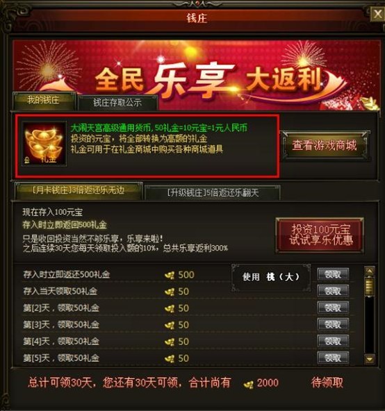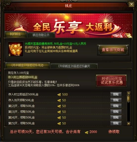 钱庄是以每日领取和等级领取礼金的一种方式,比如玩家前期投入了一定的元宝,玩家