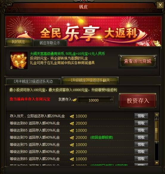存入数量限制:用户可以最小存入100元宝至最大存入10000元宝,升级享受5倍返利!