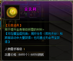 金舍利:用于提升金身层数所需的材料。可在藏宝阁兑换,周环任务(即将开放)和跨服活动中大量获得,也可通过天命寻宝获得。