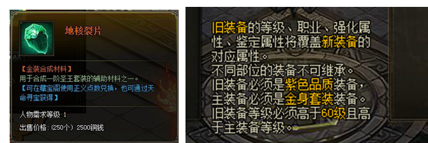 地核裂片:用于合成套装的辅助材料之一。可在藏宝阁使用战场点数兑换,也可通过天命寻宝获得。