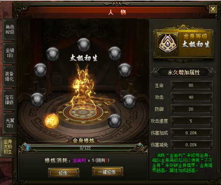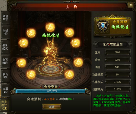 玩家可以消耗“金舍利”来修炼金身,每阶金身满级后可以使用“不灭金身”来突破金身境界。金身境界越高,属性加成越高。
