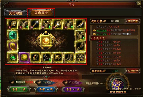 寻宝系统中新增天命寻宝,主要产出低阶金装、金装碎片、元神金身相关道具、经验等各种稀有装备道具。