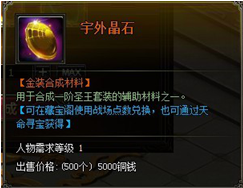 宇外晶石:用于合成套装的辅助材料之一。可在藏宝阁使用战场点数兑换,也可通过天命寻宝获得。