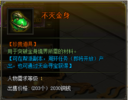 不灭金身:用于突破金身境界所需的材料。可在帮派副本,周环任务(即将开放)产出,也可通过天命寻宝获得。
