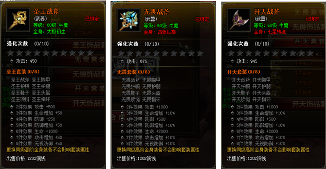 3、 套装属性:依次为圣王套装—无畏套装—开天套装