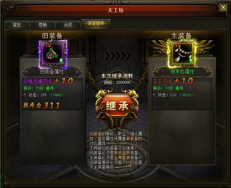 紫色装备的等级、职业、强化属性、鉴定属性可以继承给金身套装。
