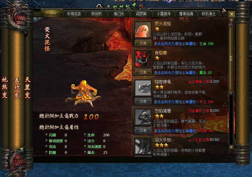3、五行变激活后将永久增加主角属性,不同的变身增加属性不同。(激活的变身属性会叠加到主角身上)