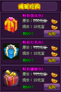 活动期间仅三天,伙伴、锻造、异火界面增加超值限量礼包【特价金品包,特价一阶猎火包,特价二阶猎火包,特价体悟包,特价洗灵包,小医仙召唤令,特价强化包Ⅰ,特价打孔包Ⅰ,特价镶嵌包Ⅰ】,活动期间每天限量出售,不要错过机会喔!
