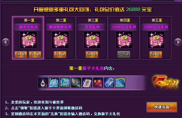 1、活动期间,玩家满足累计充值1000、2000、5000、10000、20000元宝,满足以上档次均可领取超级豪华大礼包;