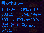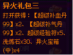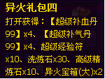 活动期间每天累计充值达到19999元宝,第2天即可获得包括“累计充值19999礼包”【异火礼包四*2、凤凰精血*50、金品吞噬丹*20、毒经秘籍*100,灵魂丹*100】;道具绑定