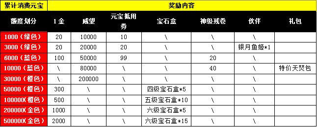 注:交易、市场、摆摊、百强争霸赛元宝流通,不计入本次累计消费元宝活动;