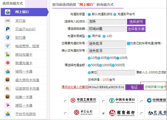 2:根据个人充值金额填入相应的优惠码,例如充值100,则填入优惠码1