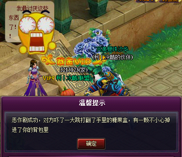 2、把这些恶作剧物品提交给对应的人,会令他们吓一大跳,打翻手里的糖果盒,有一颗不小心就落到了你的背包里;